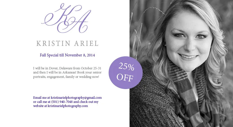 Since I will be graduating soon I wanted to post my first sale! Dover friends I'll be in the area from October 26-31 for pictures and then I'll be in Arkansas! Book now to get this special it won't last long and the first 10 (5 from Delaware and 5 from Arkansas) will get an extra special! It won't last long but it's a good way to get those fall and Christmas pictures done! Email me at kristinarielphotography@gmail.com or call me at 501-940-7048 to book your session now!