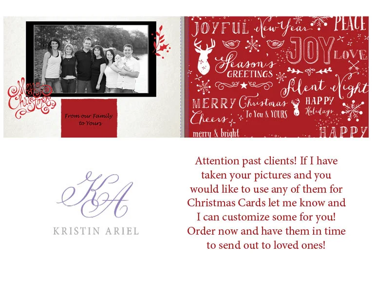 If I have ever taken pictures of you and you want Christmas Pictures let me know! I can customize a Christmas card special for you and your family to share! Get 24 cards for $40 this includes shipping! Get them now so you can share them with loved ones!